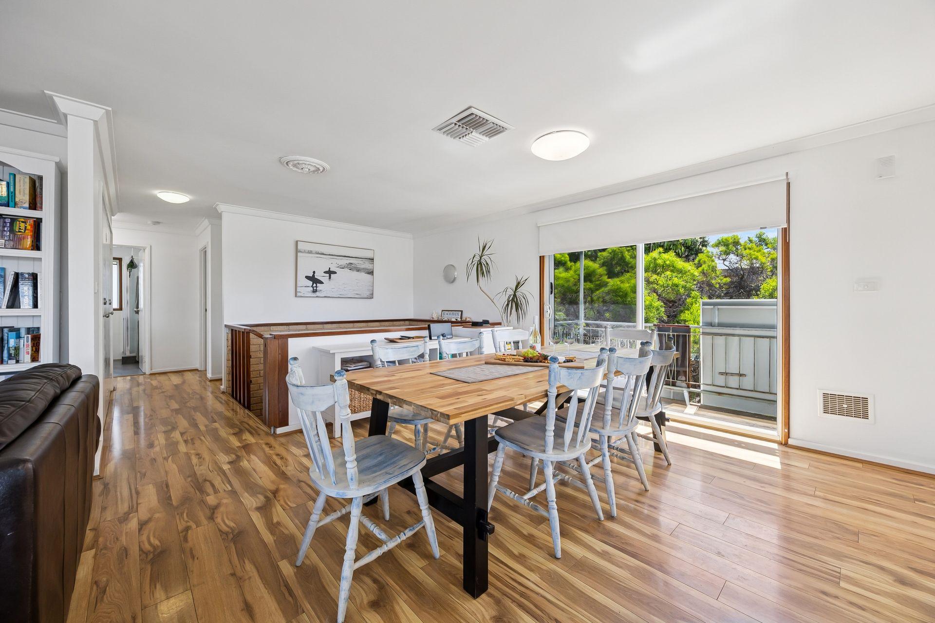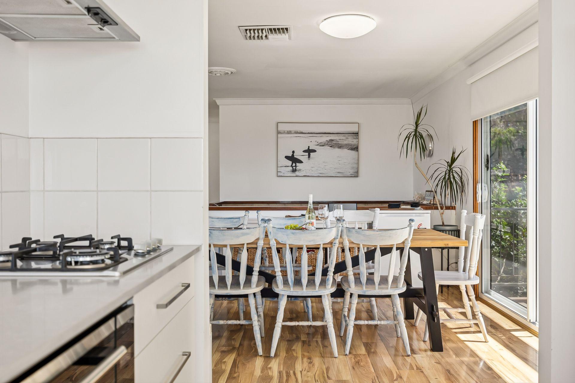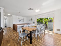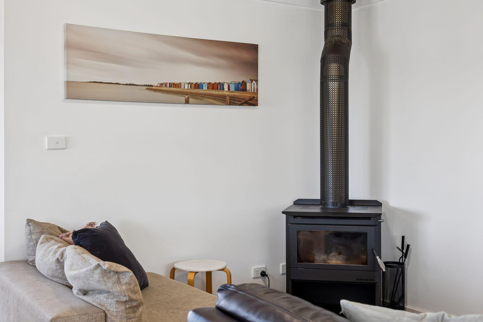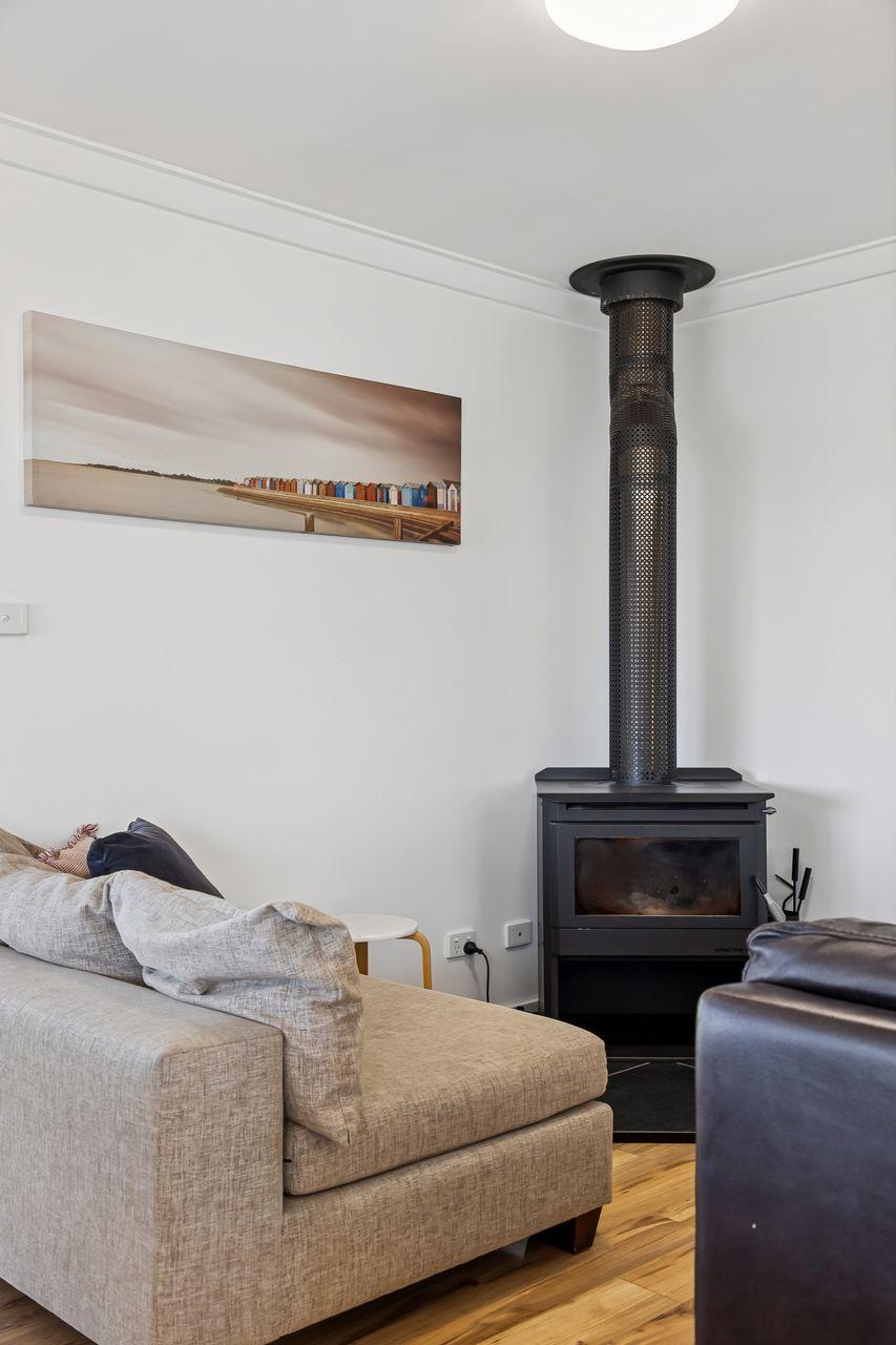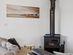 Inside, the upper level forms the heart of the home, with a light-filled open-plan living, dining, and modern kitchen area designed for gathering and connection. The fully equipped kitchen offers everything you need for easy entertaining, while the comfortable lounge with indoor wood fire creates a warm, inviting space to unwind after a day at the beach.