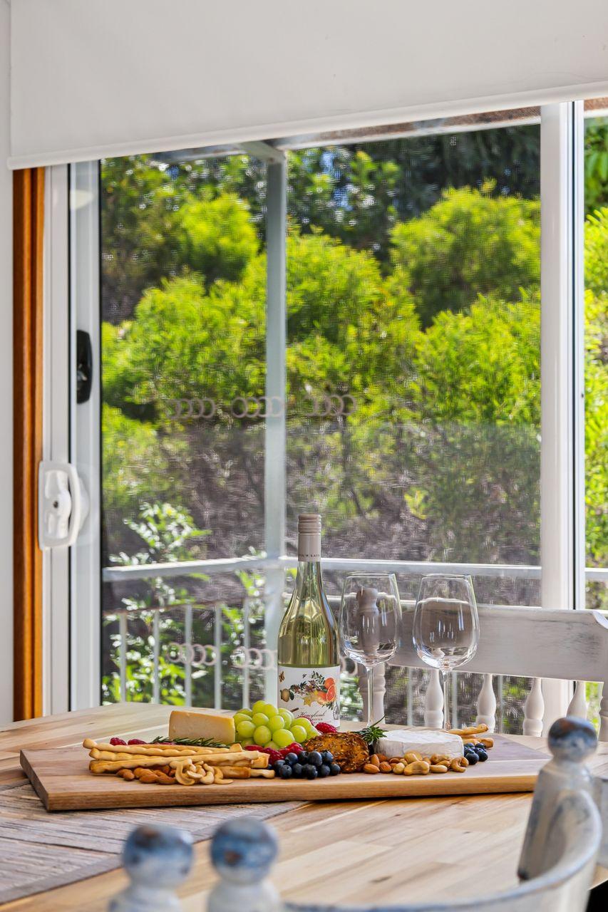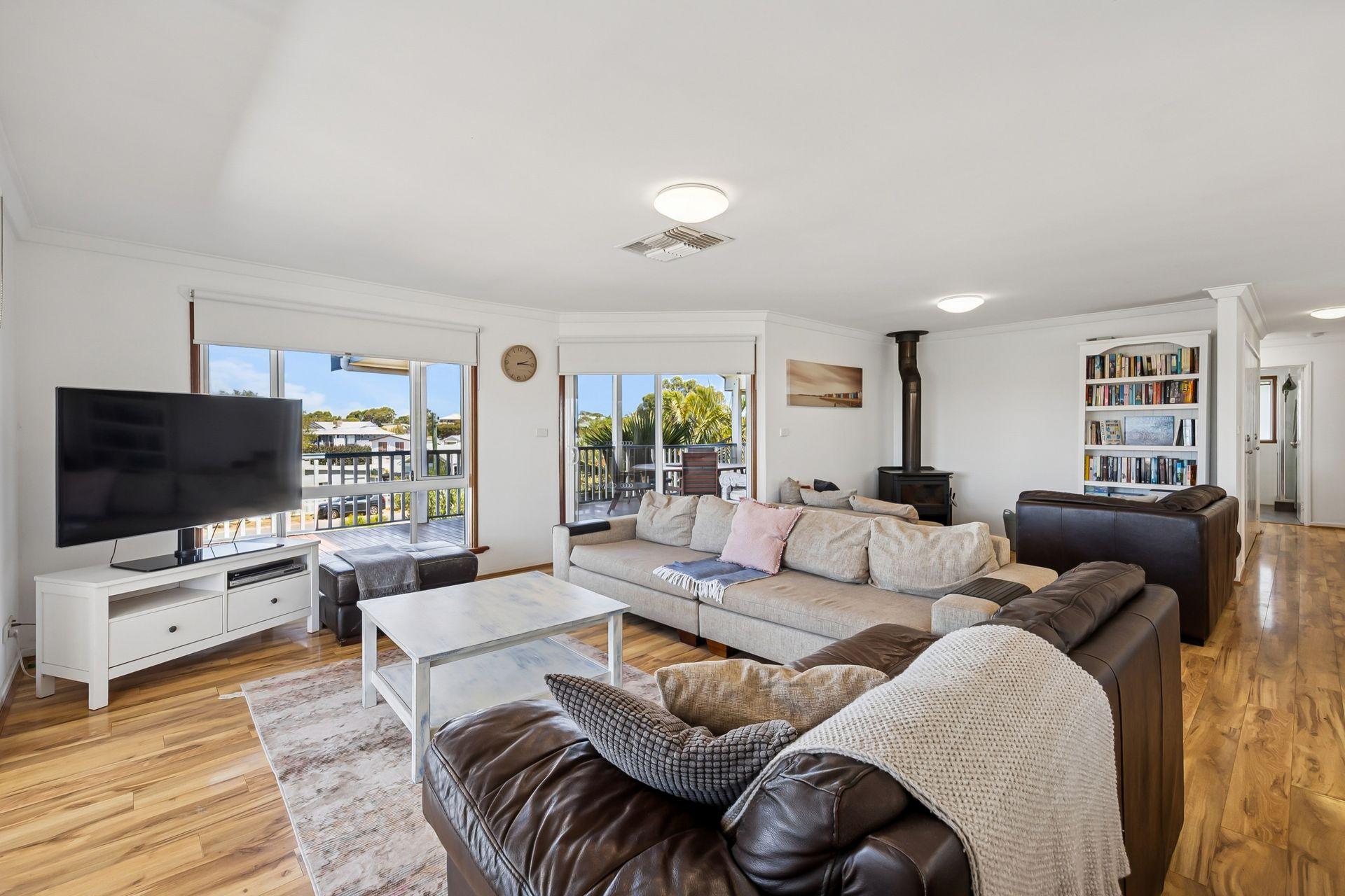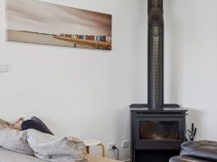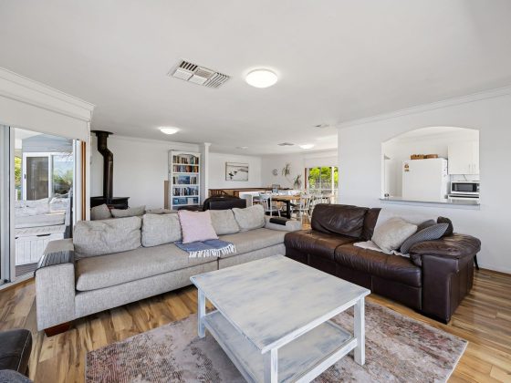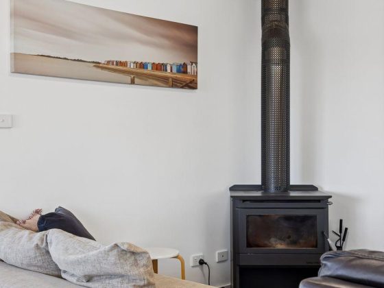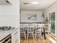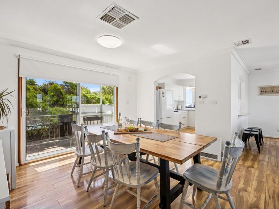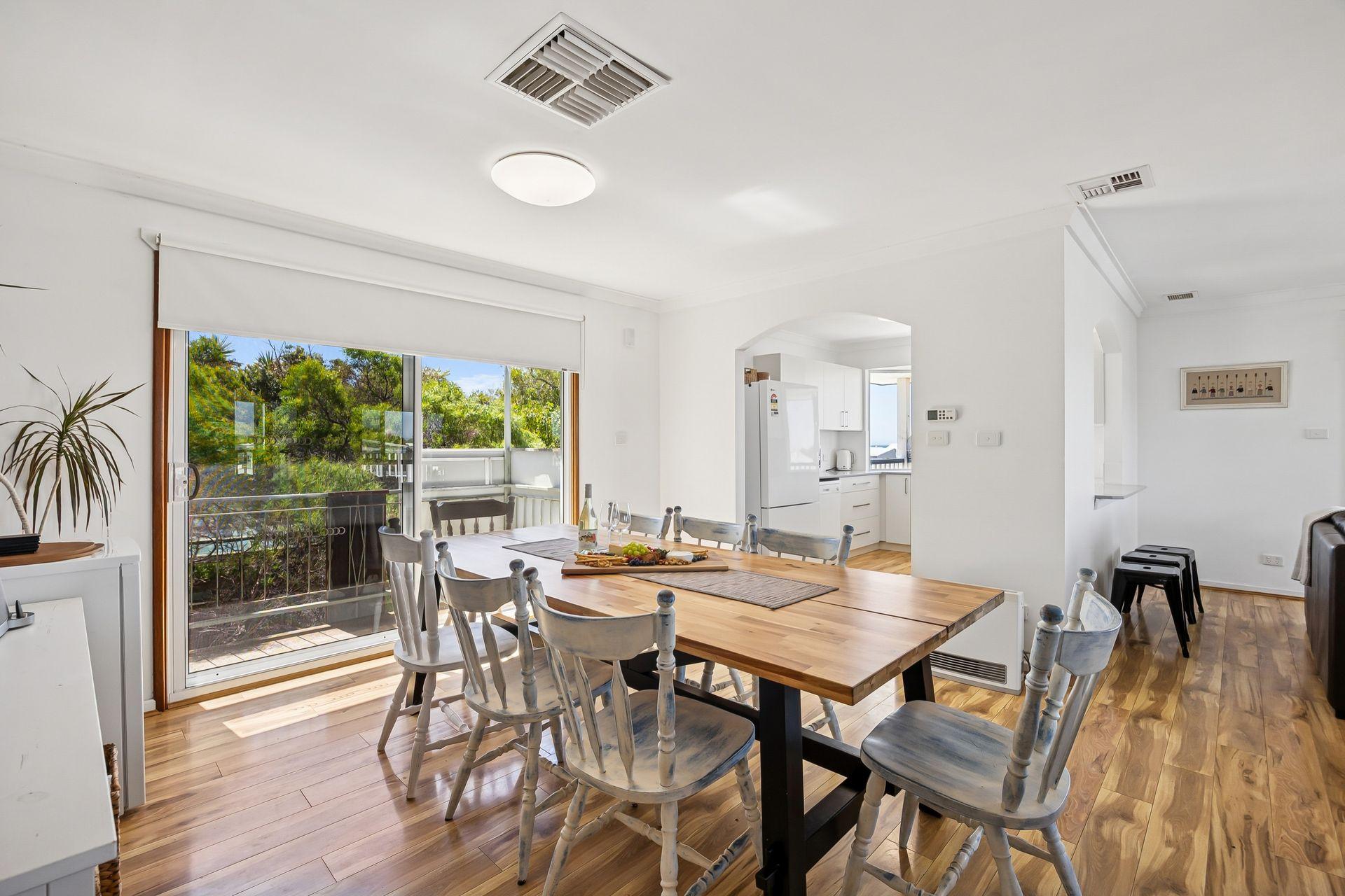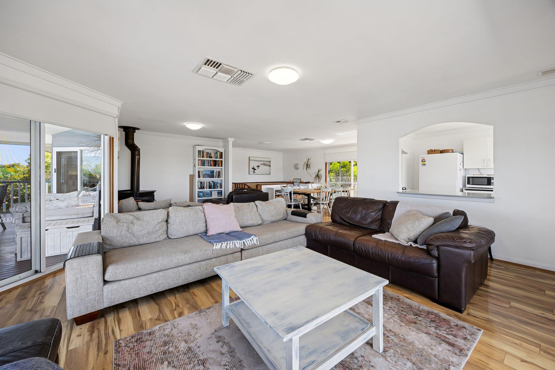 Inside, the upper level forms the heart of the home, with a light-filled open-plan living, dining, and modern kitchen area designed for gathering and connection. The fully equipped kitchen offers everything you need for easy entertaining, while the comfortable lounge with indoor wood fire creates a warm, inviting space to unwind after a day at the beach.