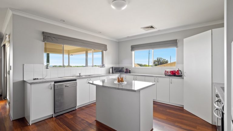 The well appointed home features a large kitchen has a dishwasher, island prep bench with and work space all overlooking the dining, living & theatre, delivering uninterrupted views of Geographe Bay.
