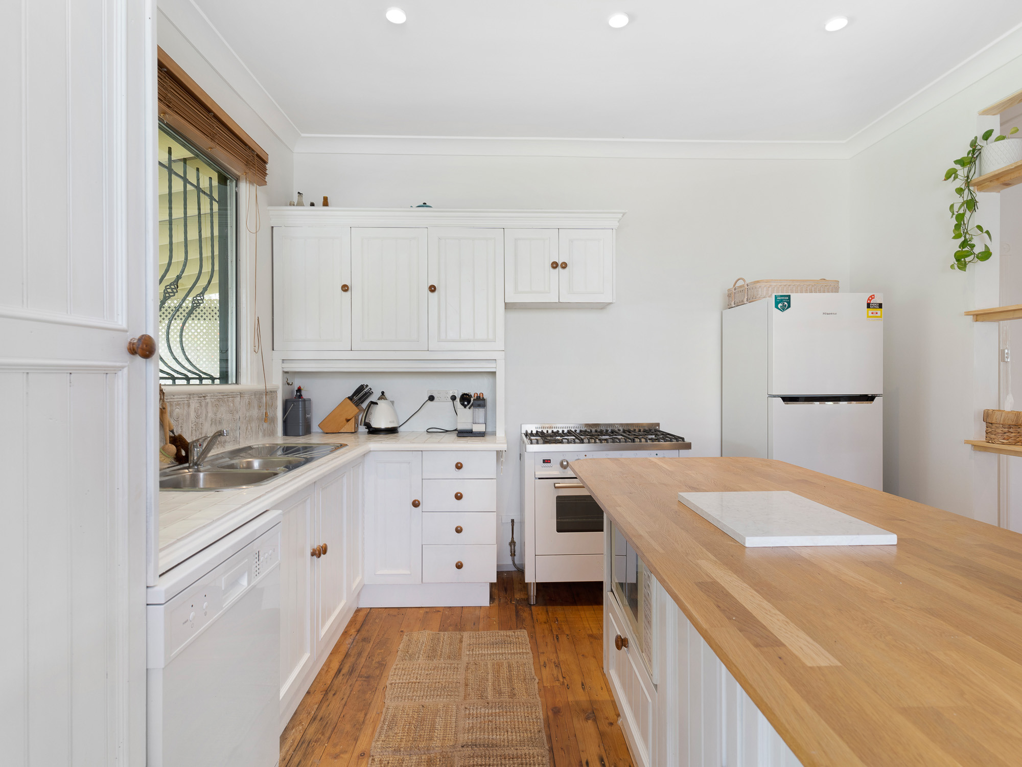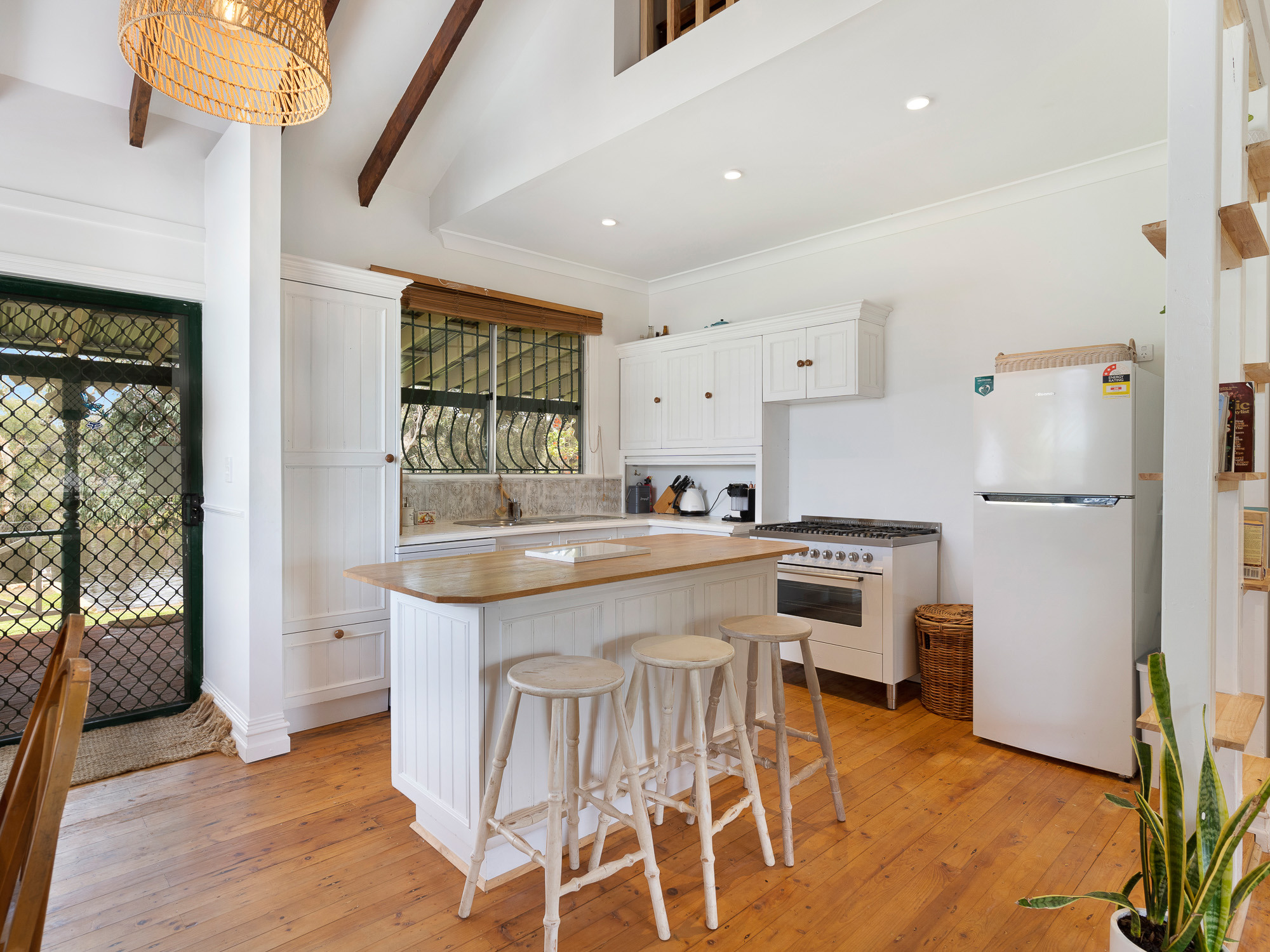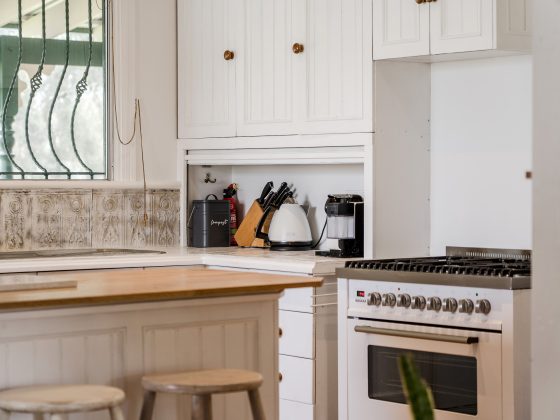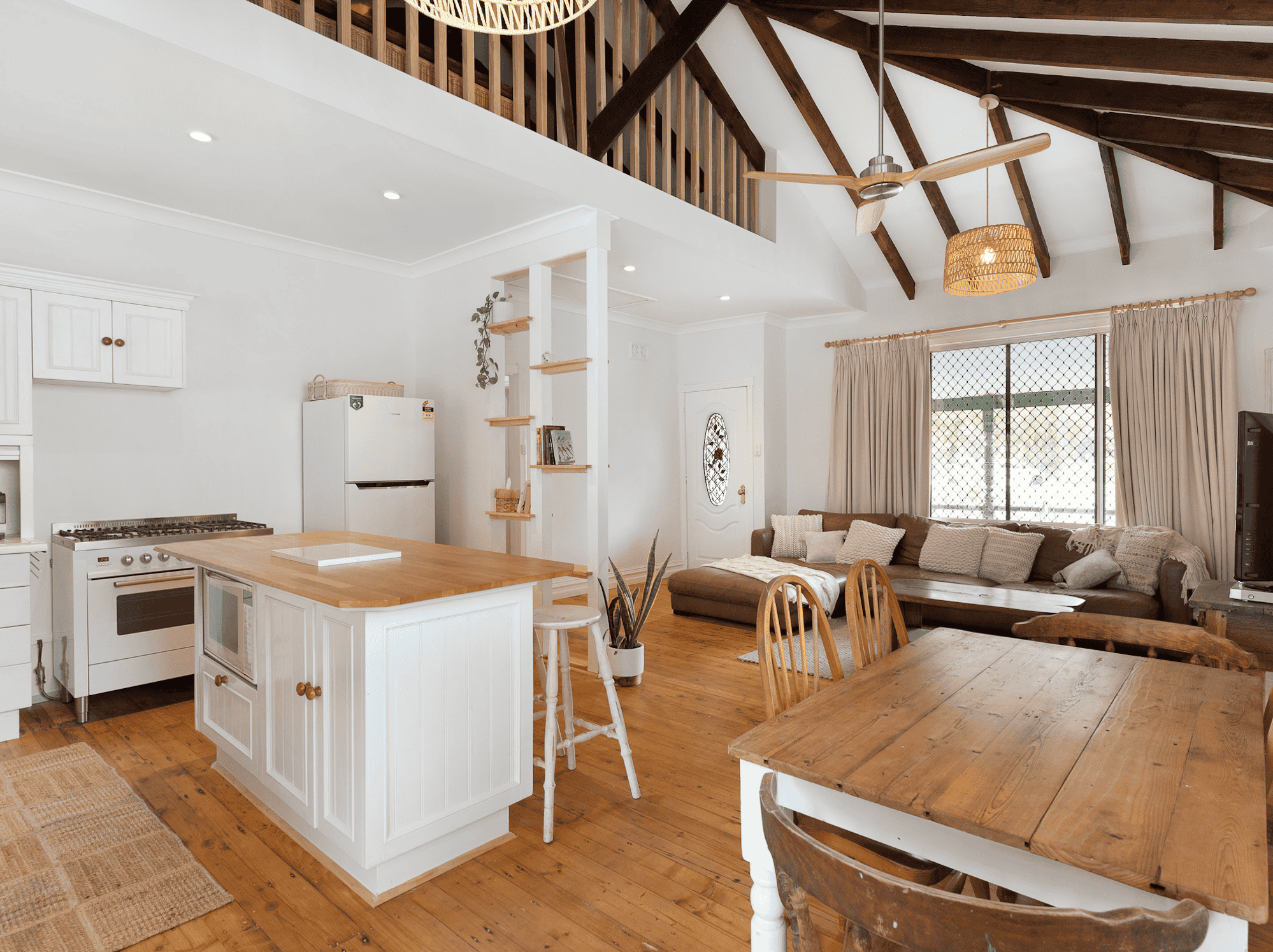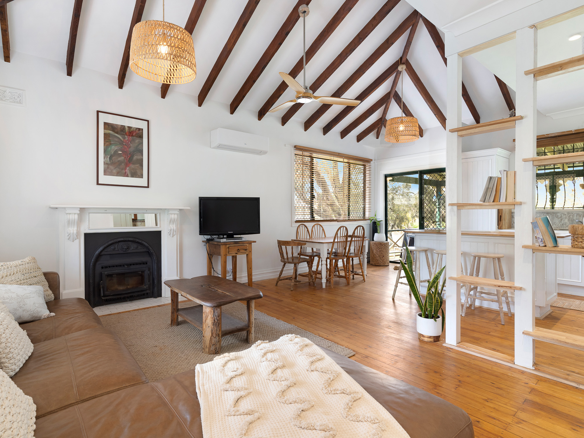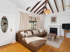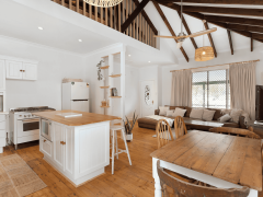 Inside, the cottage blends timeless character with modern comfort. The open-plan living area features soaring timber ceilings, warm wooden floors, and a perfectly appointed kitchen with everything you need, including a dishwasher and Nespresso coffee machine. The cosy lounge invites you to unwind with an Apple TV-enabled television, wood fireplace, reverse-cycle air conditioning, and a selection of board games, DVDs, and entertainment for the whole family.